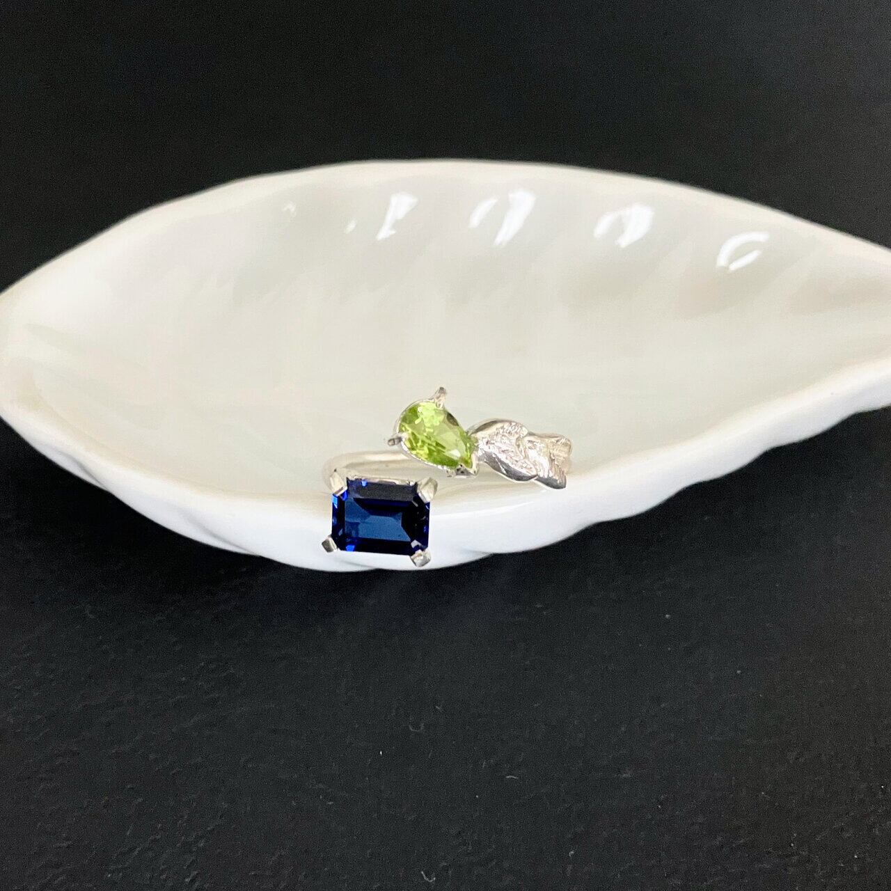爽やかなミントグリーンのペリドットに宇宙から見る地球の碧さを感じる深い青色が美しいブルーのジルコニアを合わせたフォークリング。